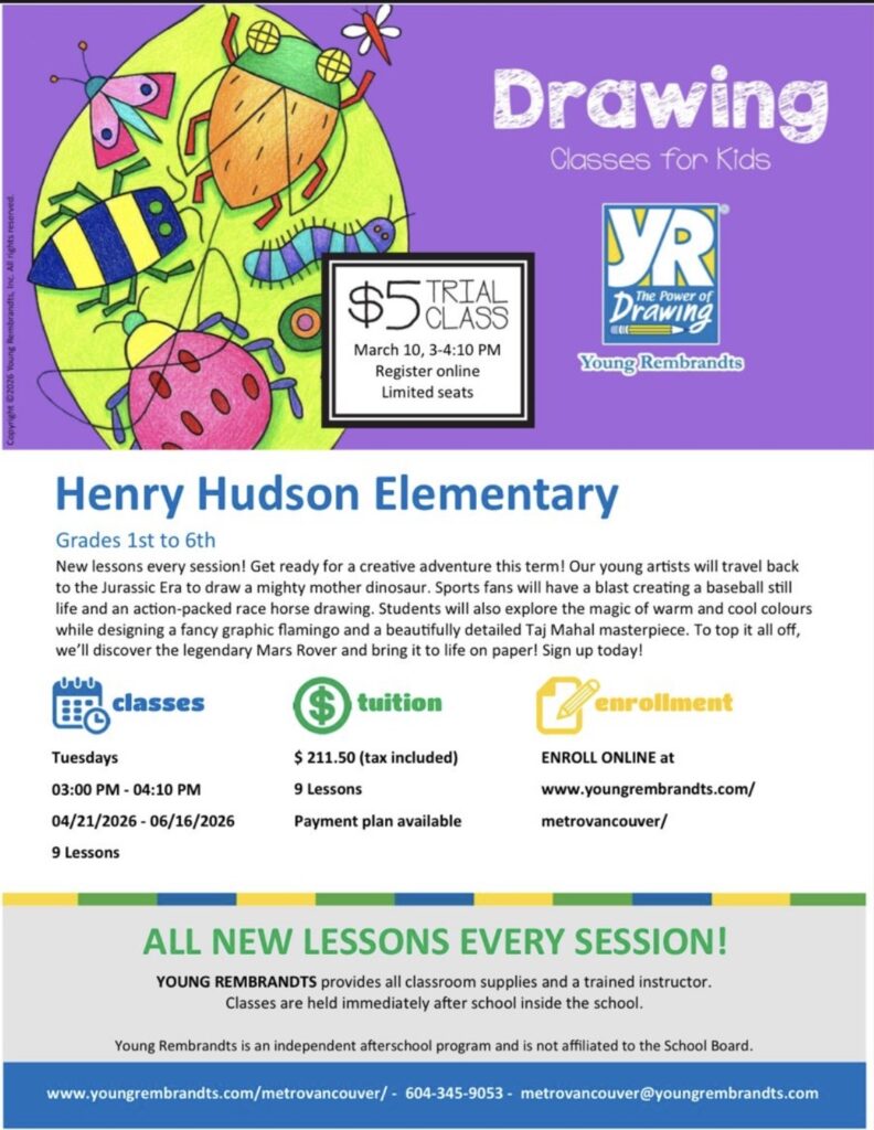 Community programs take place at Henry Hudson after school hours. While these programs are neither run or sponsored by Henry Hudson admin or VSB, we encourage parents to see if any are of interest to your kids. More programs and the details of which can all be found on the bulletin board just inside the front entrance of the school